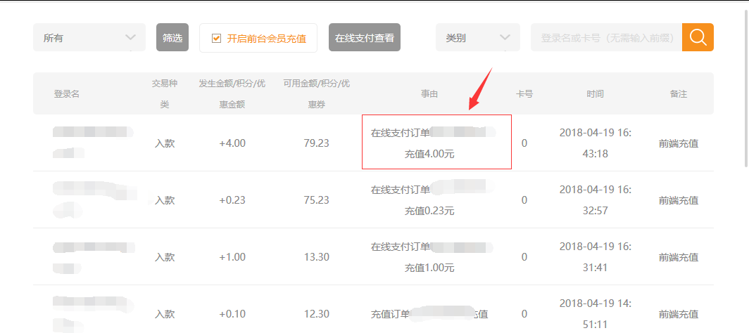 ⑦.在后台会员交易中,可以看到所有支付成功的订单(后台充值和前台充值),为了区分订单,在事由中有描述,如下图: